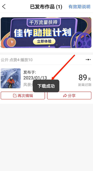 5、返回作品界面,若显示“下载成功”提示,即说明视频已成功保存到本地相册。