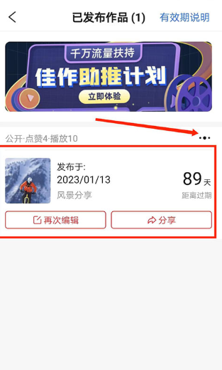 3、在已发布作品列表中,选中需要保存的视频,点击视频旁的“三个点”更多选项。
