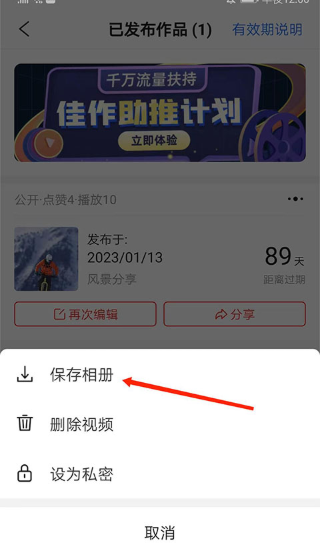 4、弹出“保存相册”“删除视频”“设为私密”三个选项,点击选择“保存相册”。