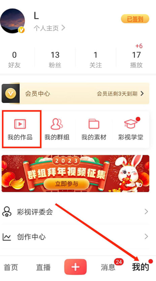 1、首先在本站下载并打开彩视APP,选择右下方“我的”选项,进入个人中心界面后点击“我的作品”图标。