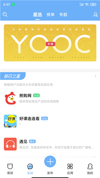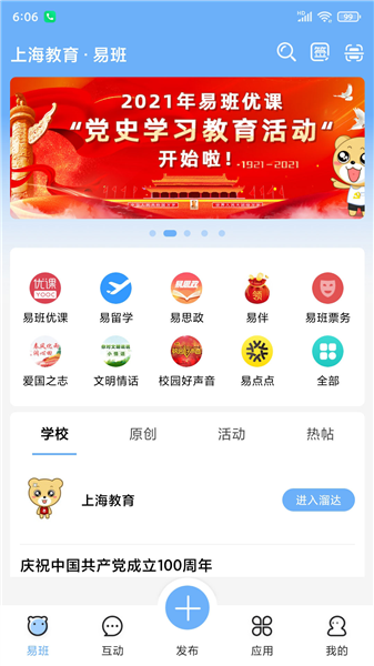 易班是一款由上海易班企业发展有限公司研发的高校娱乐教育互动社区,易班提供了教育教学、生活服务、文化娱乐的综合性互动社区。易班在高校中设立了学生工作站,开展了丰富多彩的校园文化活动,已经成为全国教育系统的知名文化品牌。易班除了为在校大学生提供日常的交互之外,也非常注重高校之间的联系。在这里大家不仅可以在各高校老师们的官方账号上与老师们进行交流互动,同时还能获取第一手的课件资讯、分享资源课件。