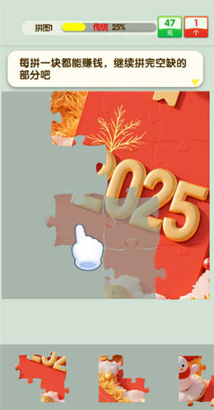2、每拼一快都能获得红包,并且需要不断拼图。