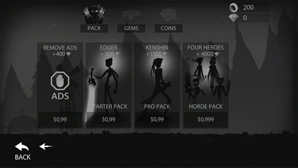 1、进入游戏后会出现五位不同的火柴人,除了第一位初始火柴人之外,剩余的需要利用金币和砖石来进行解锁,