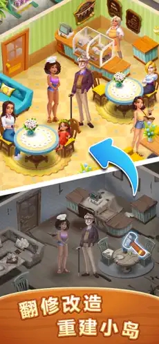 1、重建小岛:通过完成订单赚取金币和建筑材料,帮助主角修复被风暴摧毁的建筑,欣赏地中海小岛的美景!