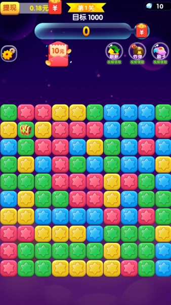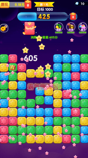 消除星星乐红包版是一个非常有趣的消除闯关游戏,玩法很简单,玩家只需点击相邻的同色方块进行消除即可,每次完成消除任务后还能获取丰厚的游戏奖励哦。整体操作并不复杂,玩家随时随地都能打开游戏进行游玩,非常适合在通勤等碎片化时间进行游戏,享受乐趣。