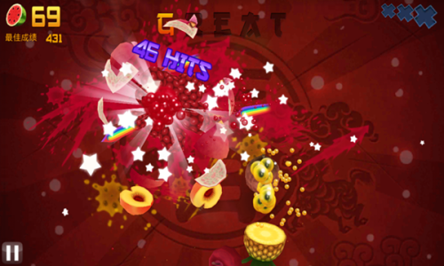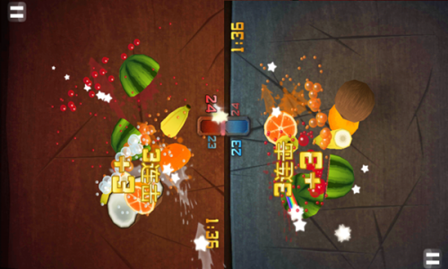 四、Zen:图标为苹果的Zen模式中,没有炸弹,只会不断出现水果,时间为1分半。在这一分半内谁因连击而切出的分数越高,谁就是胜利者。游戏不会因水果的掉落而失败。
