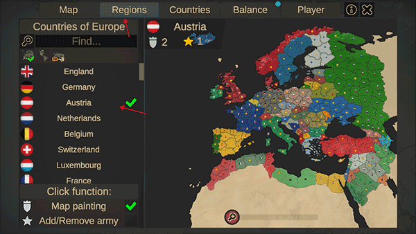 5、动态世界系统:地图包含72块区域(含海洋与首都),每块区域具备独立税收与战略价值,随游戏进程动态变化。