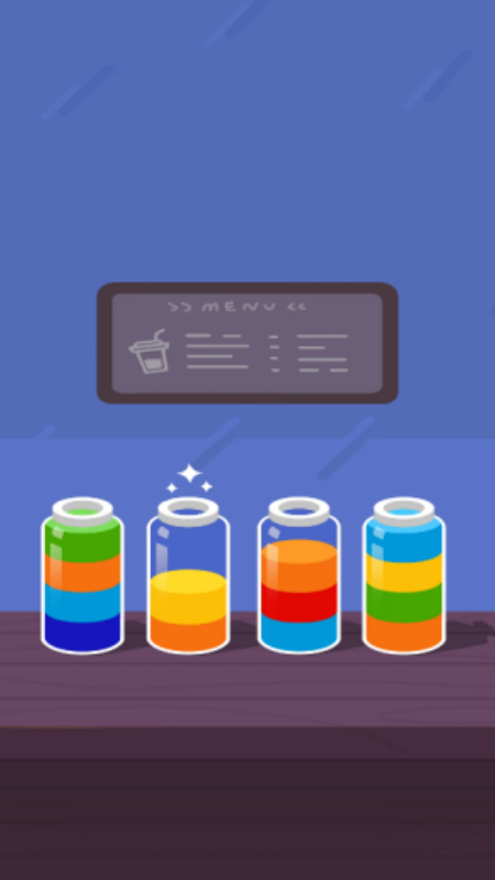 2、将各种各样的不同颜色的液体都倒到一个瓶子中,就可以完成各种关卡了。