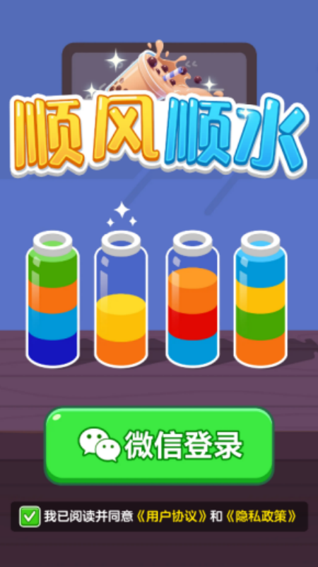 顺风顺水游戏是一款主打解压玩法的休闲闯关游戏,每个关卡面对的挑战都是不相同的哦,你要做的就是将不同关卡之中存在的水瓶进行调整,将混乱的水根据颜色分成不同的瓶子进行放置即可,当然还是需要动脑子去调整先后顺序的哦。