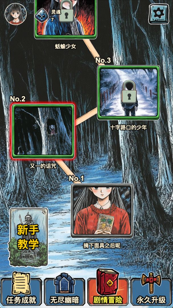 4、章节式恐怖叙事:游戏采用“一章一故事”的结构,每个章节呈现一段独立的恐怖事件,如漩涡、蛞蝓、十字路口的少年等,风格致敬经典日式恐怖漫画。