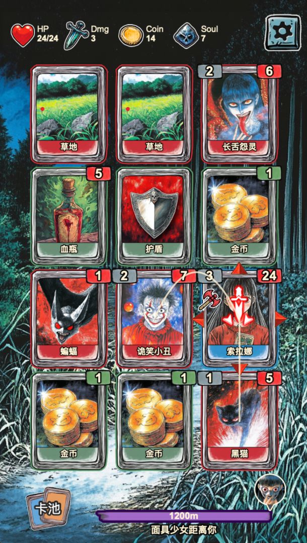 1、氛围驱动的卡牌DBG玩法:融合牌库构筑(Deck-Building Game)机制与恐怖叙事,卡牌不仅是战斗工具,更是推动剧情与解谜的关键元素。