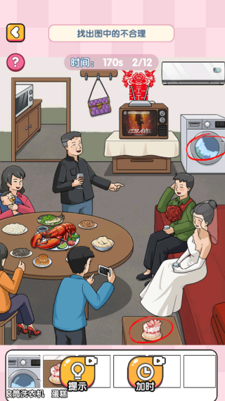 3、进入怀旧订婚宴关卡,玩家需要找出图中所有不符合该场景的物品或者动作,比如小编圈出的正在工作的洗衣机。