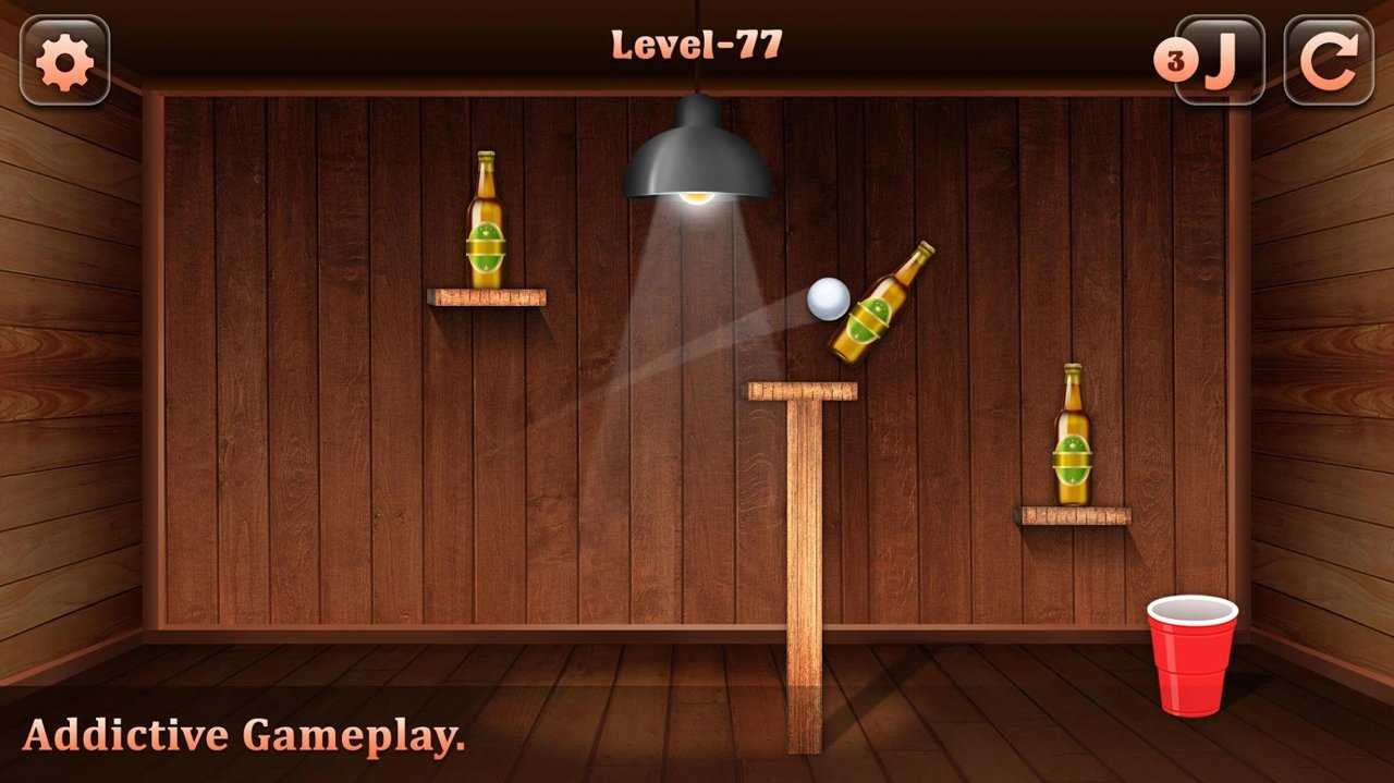 一杯三次机会,克服障碍将球投入杯中,避免击倒其他瓶子,完成关卡挑战。