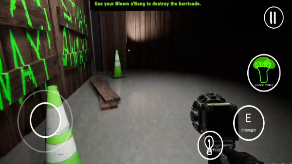 点击play进入游戏,在主界面,左侧是虚拟键控制前后左右移动,右侧则E表示射击开门,靠左边的是换灯具,照亮,最上面的是抓取碎片。