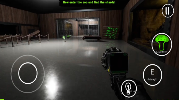 点击play进入游戏,在主界面,左侧是虚拟键控制前后左右移动,右侧则E表示射击开门,靠左边的是换灯具,照亮,最上面的是抓取碎片。