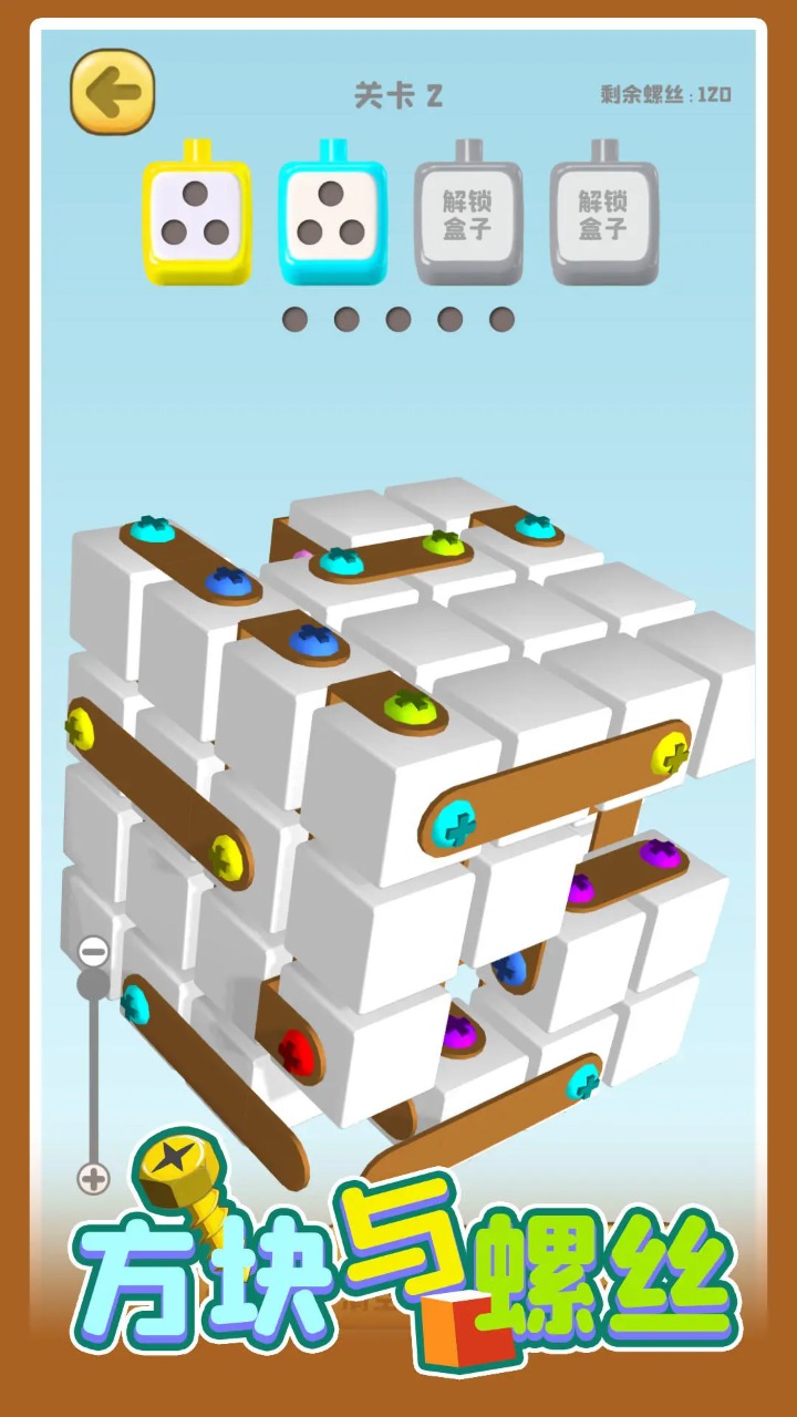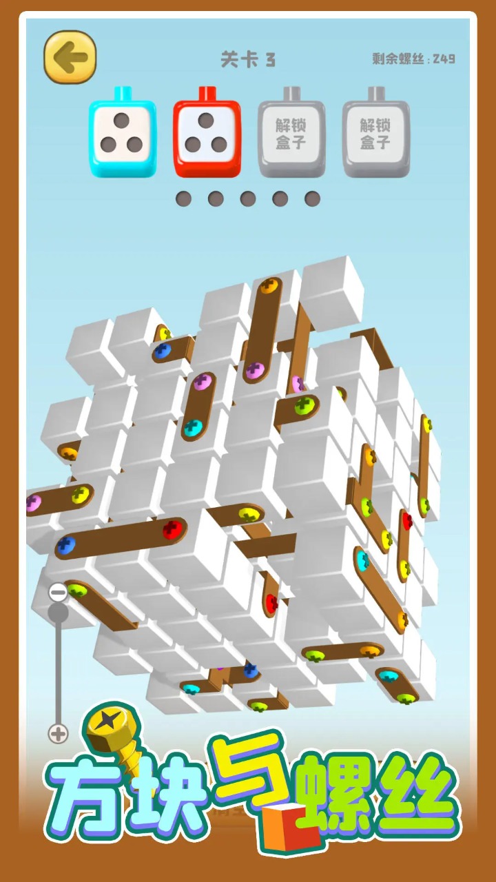 并依照正确的先后顺序将方块上的螺丝拧下来,当成功集齐三个相同颜色的螺丝时,这些螺丝就能够被消除掉,