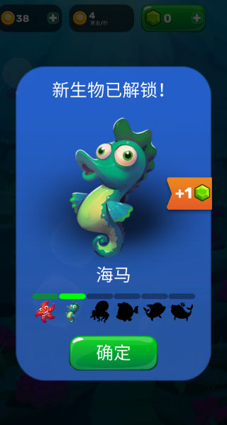 2、合成之后,可以解锁出新的动物图鉴,是海马,点击确定。