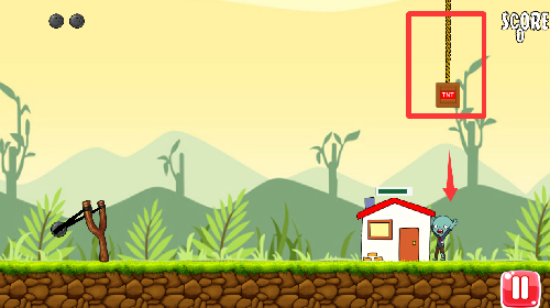 3、瞄准上面的绳子把炸弹扔到地面炸死僵尸就可以通关了。