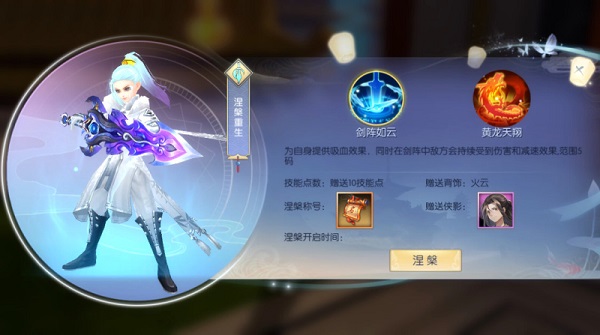 成功涅槃后,各职业将开启两个全新的涅槃技能、获得专属涅槃称号(带属性)、紫色侠影“佟石头”、以及10个额外的技能点。四大职业体系还将获得专属的涅槃时装一套。