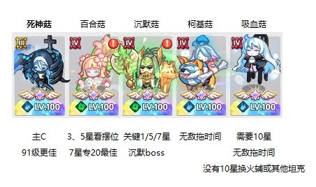 ②主C推荐选择狙击菇(老头),需达到10星方可发挥核心战力,可挑战最高80%的难度;