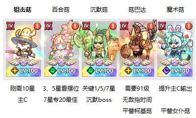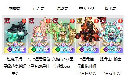①培养优先级:猎魔菇>百合菇(7星)>齐天大圣(5星)>沉默菇>魔术菇